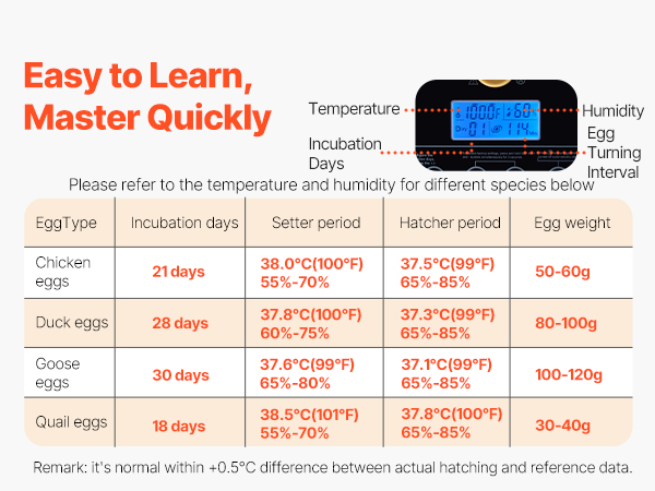 This was quick to setup. The temps are holding well. The turner has been working great on it. The display is easy to read and use. Good size for a starter incubator and easy to see inside to watch what is happening. Overall I am really happy with how this has worked so far and have enjoyed trying it out.