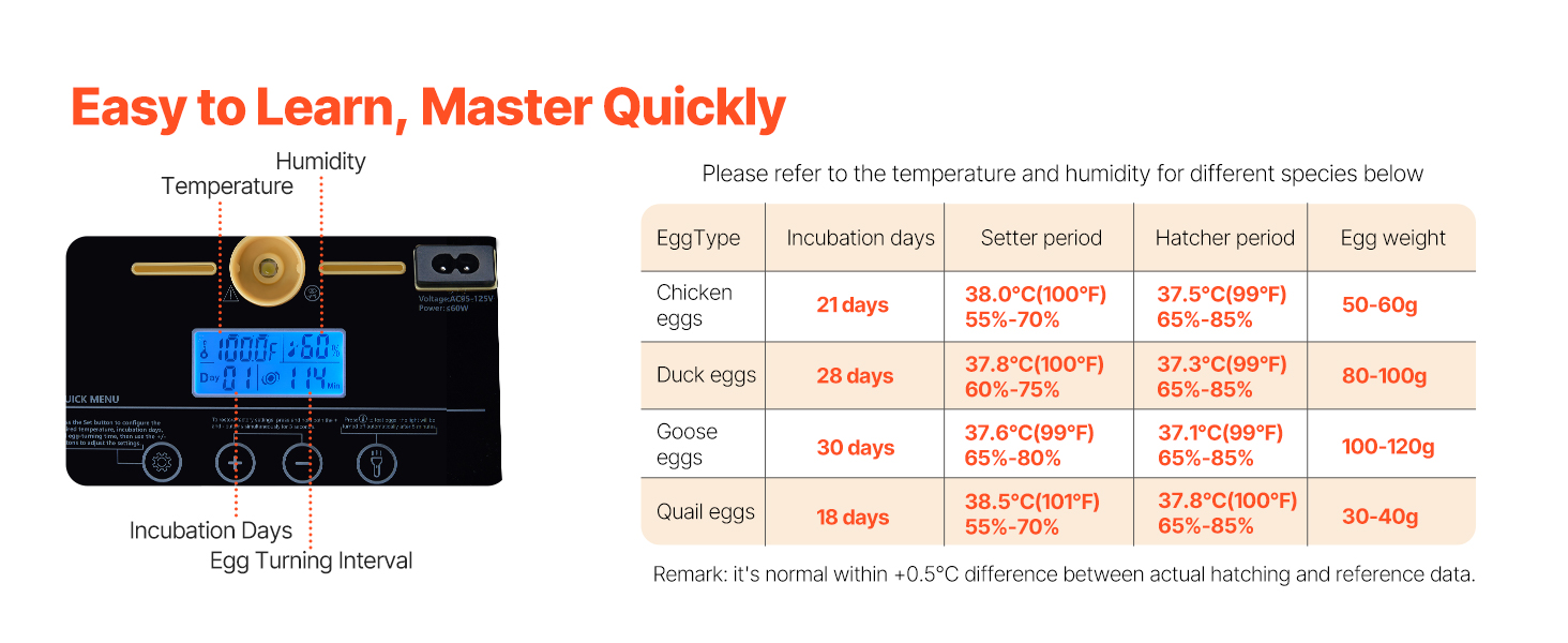 - Digital Display & Precise Control: Our hatching incubator features a digital display showing temperature and humidity. With a temperature range of 68-104°F, dual-zone auto water refill, and 360° air circulation, it ensures accurate environmental control and uniform distribution of temperature and humidity.