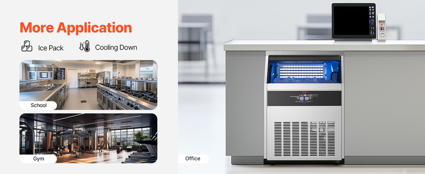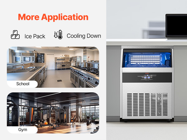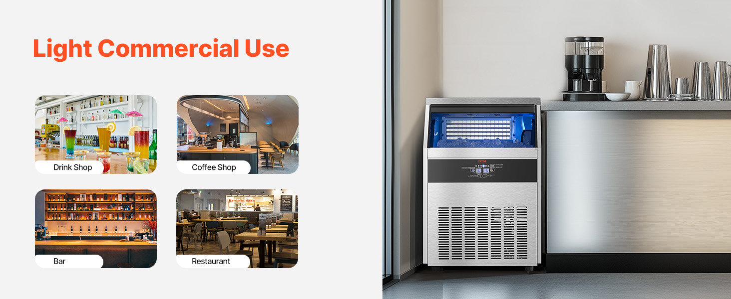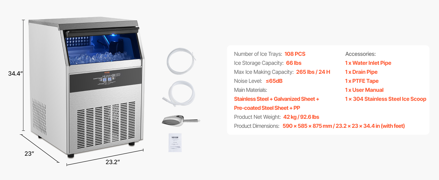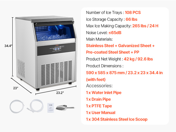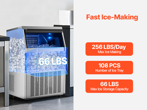 - Commercial Ice Maker: Our commercial ice maker machine is designed with 108 pcs ice trays and can produce up to 265 lbs of ice cubes per day (test conditions: 50-100.4℉/10-38℃ ambient temperature). This compact ice maker has a generous storage capacity of 66 lbs and fits perfectly in your home, coffee shop, bar, or restaurant