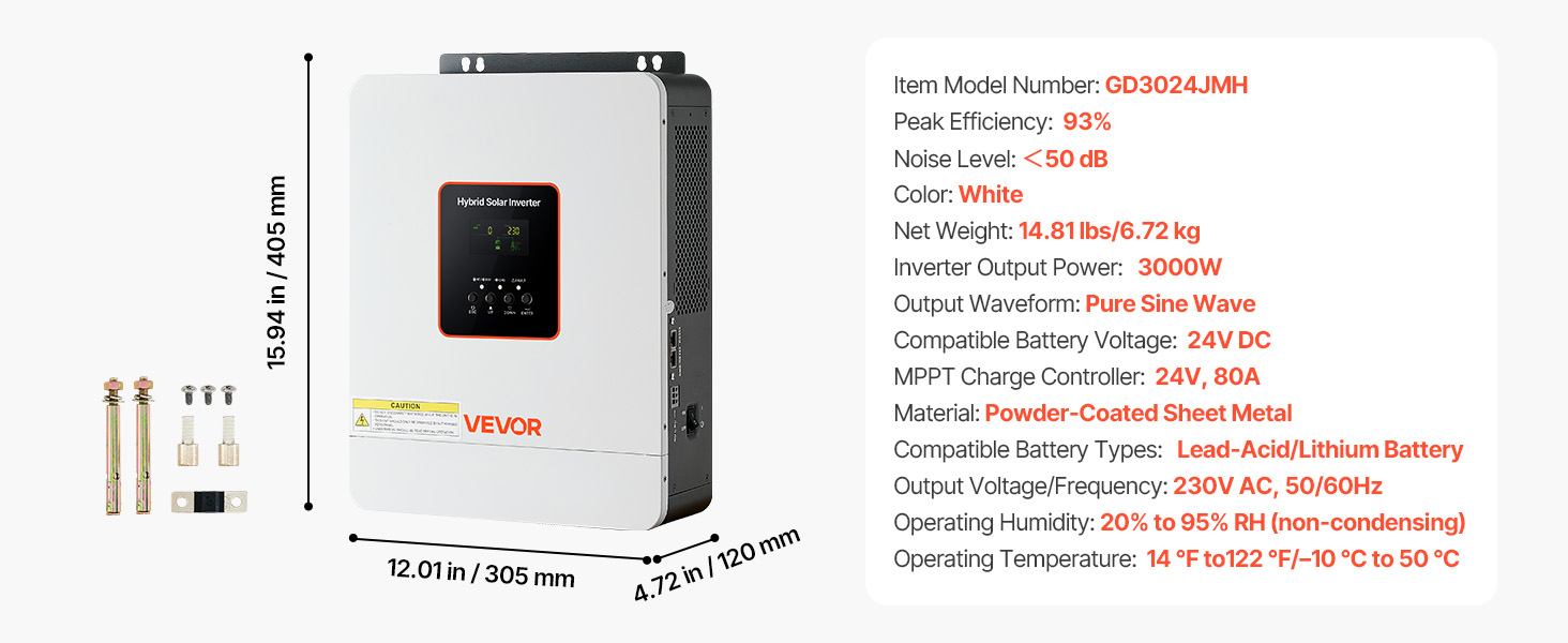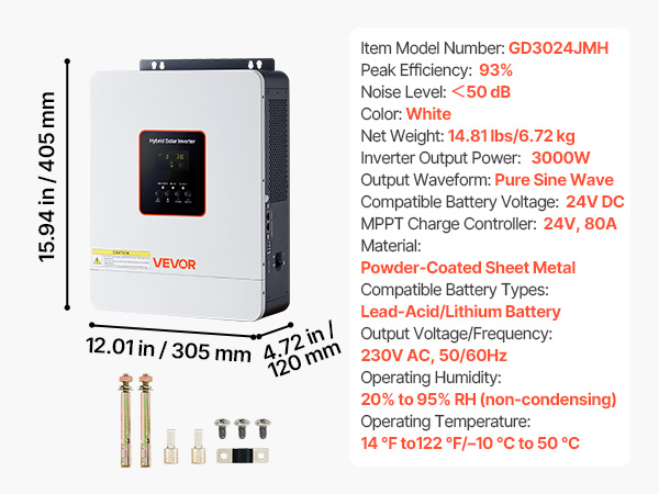• Wide Battery Compatibility: Designed for 24V battery systems, this hybrid solar power inverter supports lithium, lead-acid, and even custom battery types. Providing flexibility for your preferred storage solution