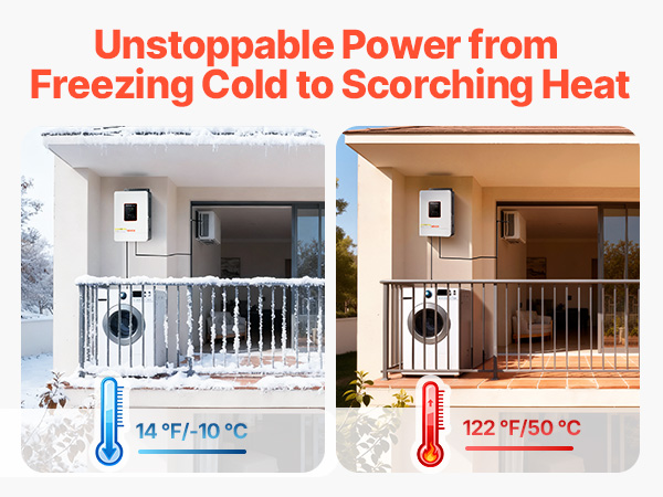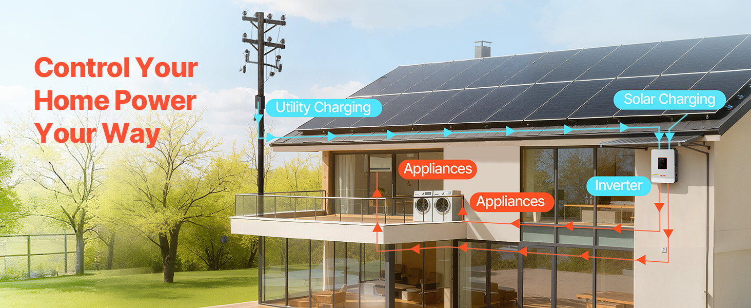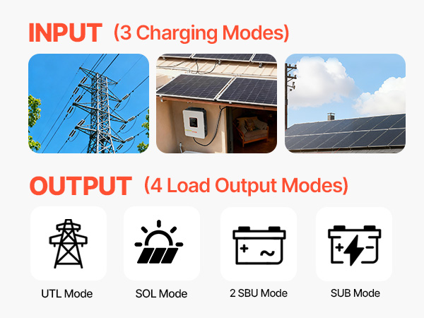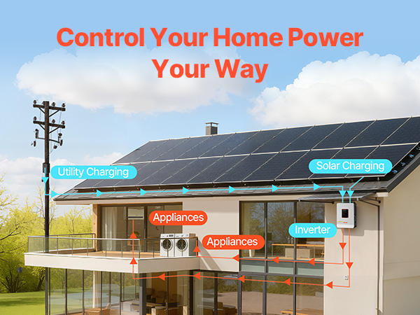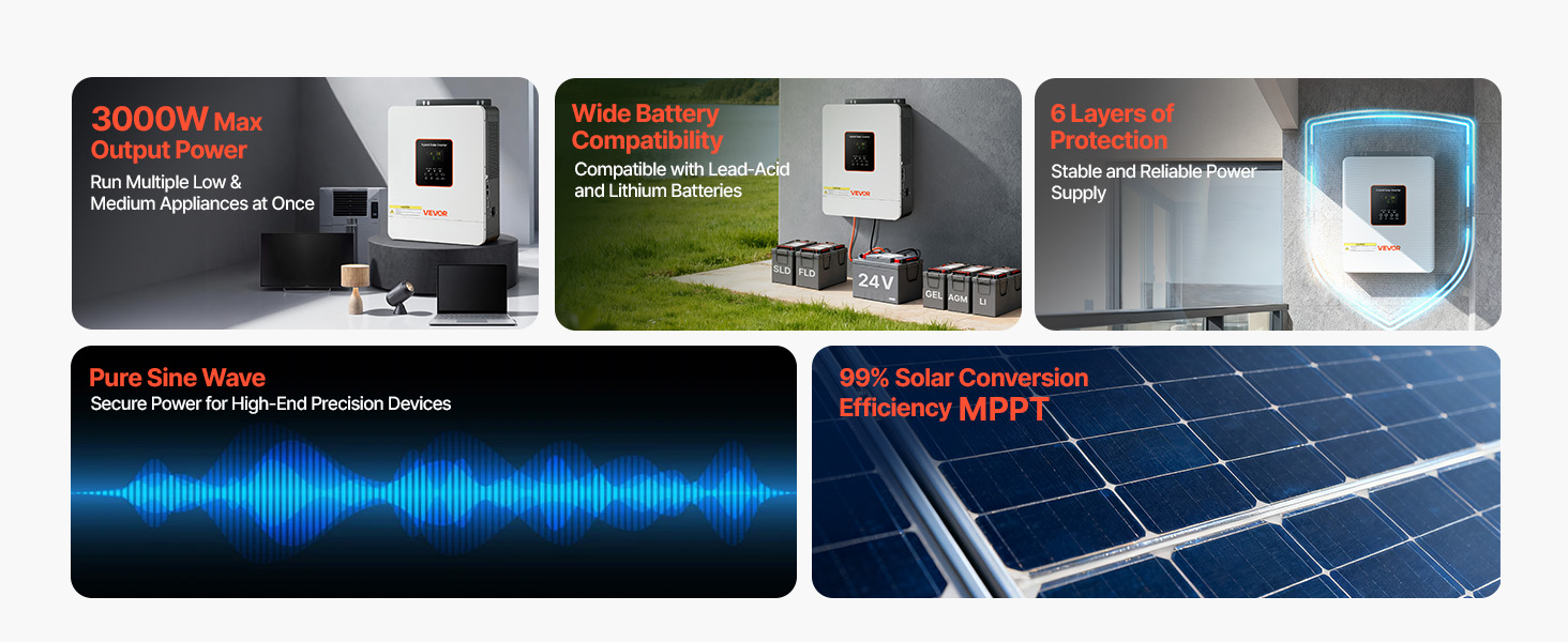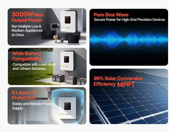 • 99% Conversion Efficiency: Equipped with an advanced MPPT solar charge controller, this hybrid inverter charger captures and converts more solar energy into usable power, significantly increasing your daily energy yield.