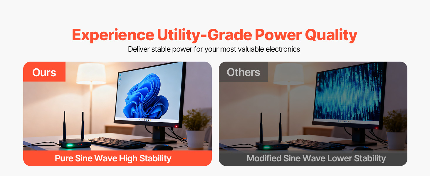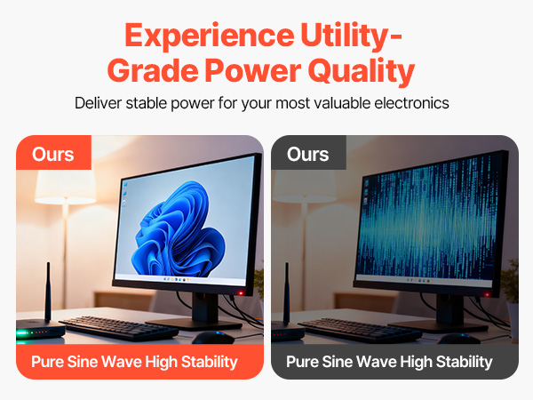 • Pure Sine Wave Output: Enjoy utility-quality electricity for your voltage-sensitive precision electronics. With a pure sine wave output, our solar power inverter ensures stable and secure operation for various home appliances, such as computers and TVs.