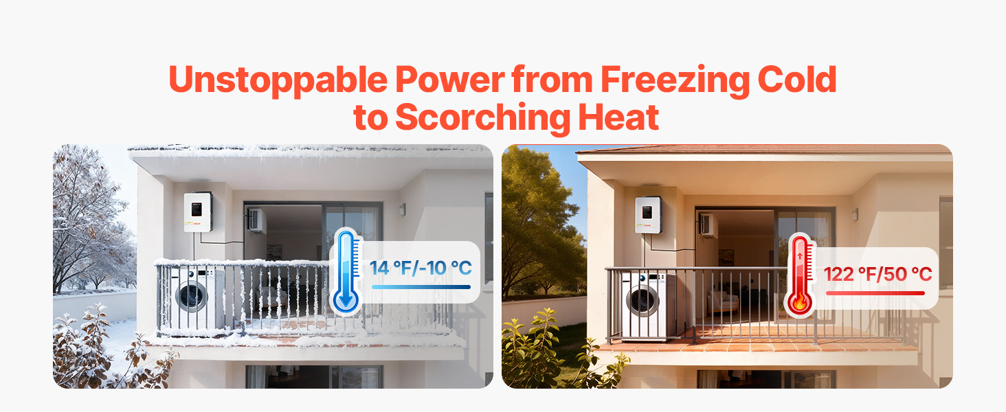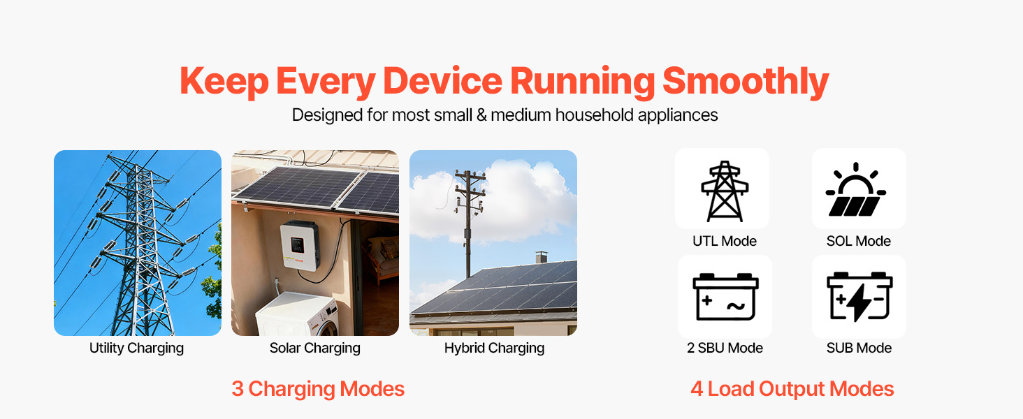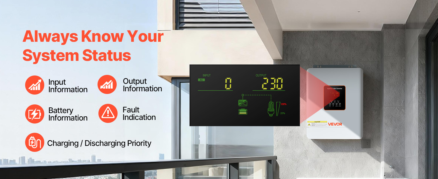 • Comprehensive Protections: Includes over-temperature, over-current, over-voltage, under-voltage, short circuit, and overload protection. This off-grid hybrid solar inverter ensures secure operation for your circuits and power supply.