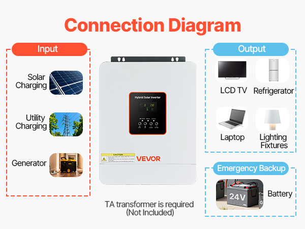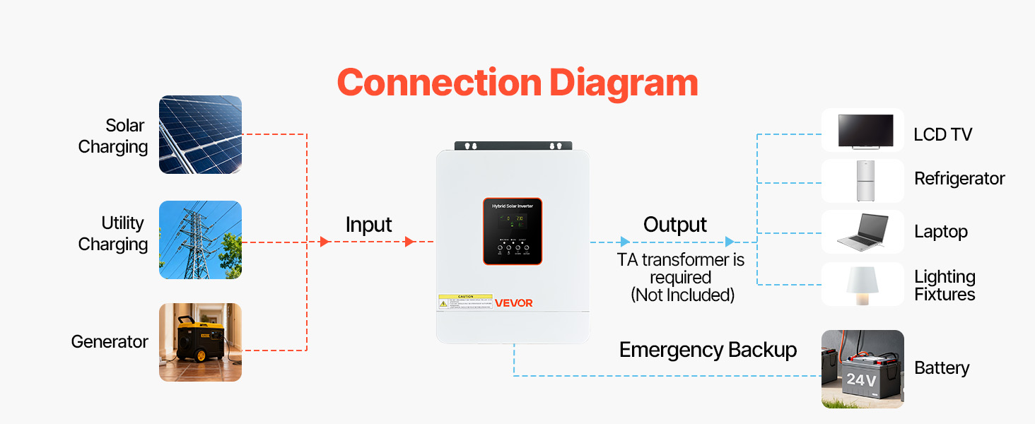• 2-in-1 Hybrid Solar Inverter: Seamlessly integrates the inverter and controller in one unit. Delivers 3000W, 230V AC single-phase pure sine wave output, making it ideal for small homes and off-grid solar systems. For appliances requiring other voltages, a transformer is required (not included).