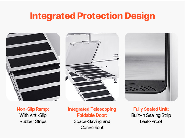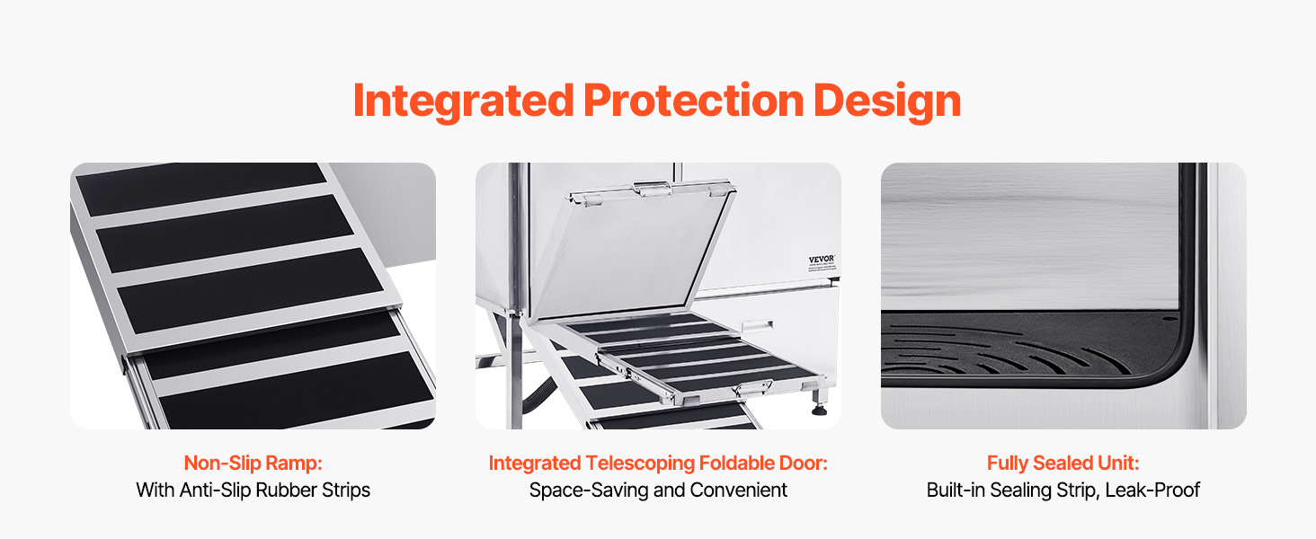 - Foldable and Space-Saving: The integrated foldable ramp door can be shortened and folded upwards to function as a door panel. The upgraded sealing system and anti-slip ramp ensure pets can enter and exit securely without slipping. The drainage kit prevents odor buildup, ensuring no water accumulation or leaks during bath time.