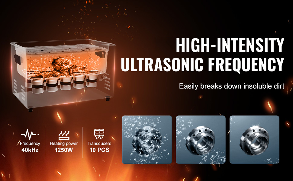 - Powerful Cleaning Performance: The VEVOR Ultrasonic Cleaner operates at an ultra-high frequency of 40kHz, generating millions of tiny bubbles that implode in water, releasing strong cleaning energy. This energy penetrates every crevice, thoroughly removing stubborn stains from delicate parts, ensuring no area is left uncleaned.
