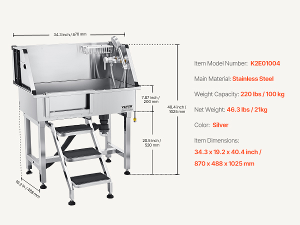 This tub ensures no water leakage. Made from stainless steel, it is corrosion-resistant and sturdy, maintaining its new look over time. The tub features smooth edges, ensuring security for both pets and users during bathing.