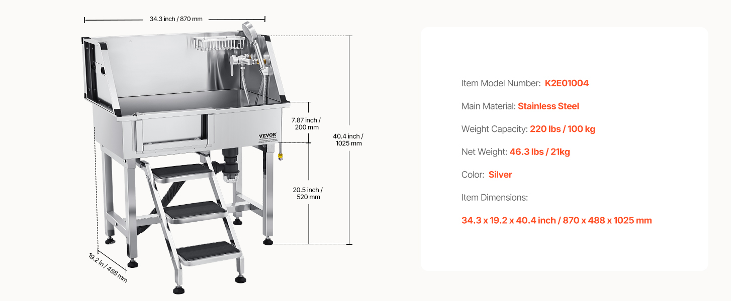 This bath works great for my 100 pound plus dogs – perfect height – no more straining back – the dogs like it better aswell much easier getting in/out for them. Only thing that I’ve noticed that could be improved is adding a latch so the sliding door stays shut I’m to add one myself. Worth the money.