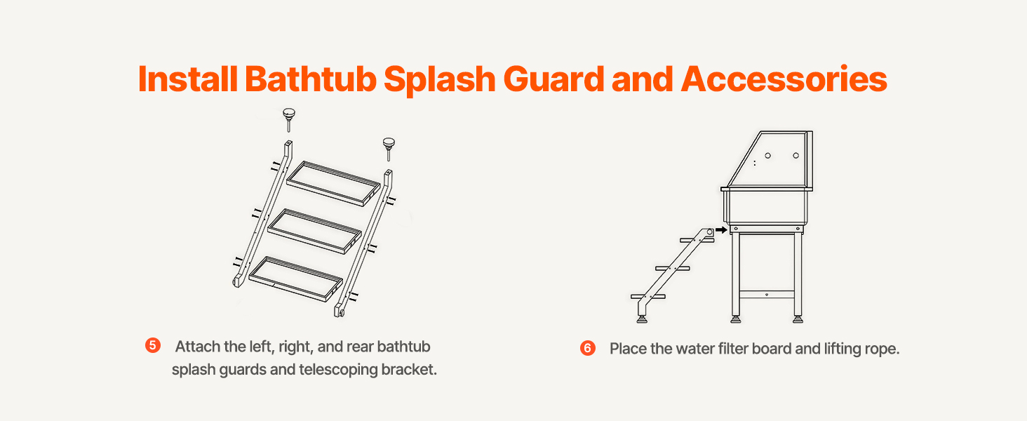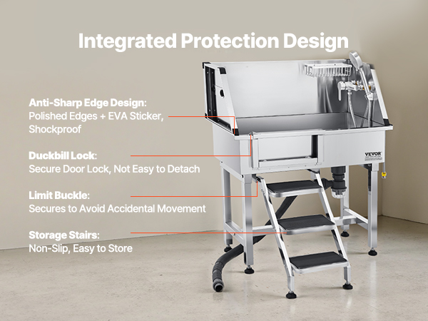 - Integrated Design: The dog grooming tub features hot and cold faucets, a dual-control showerhead, and a soap holder—this design makes pet bathing effortless and efficient. The PE water filter board provides a non-slip draining surface, while the included duckbill buckle prevents pets from accidentally triggering the door during bath time, keeping them securely inside.