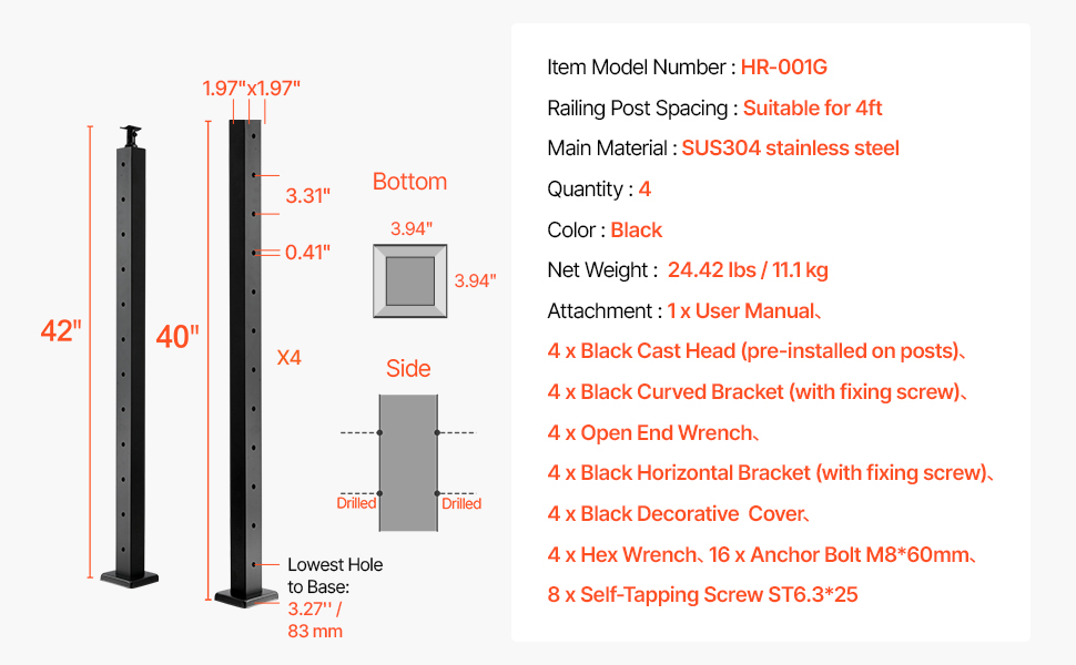 - Horizontal Hole Railing Post: This horizontal hole cable railing post is available in 42" and 36" heights, with 0.31" and 0.41" holes, totaling 10-12 holes. It is designed for horizontal ground/deck railing protection, safeguarding you and your family. Note: This product does not include wire ropes