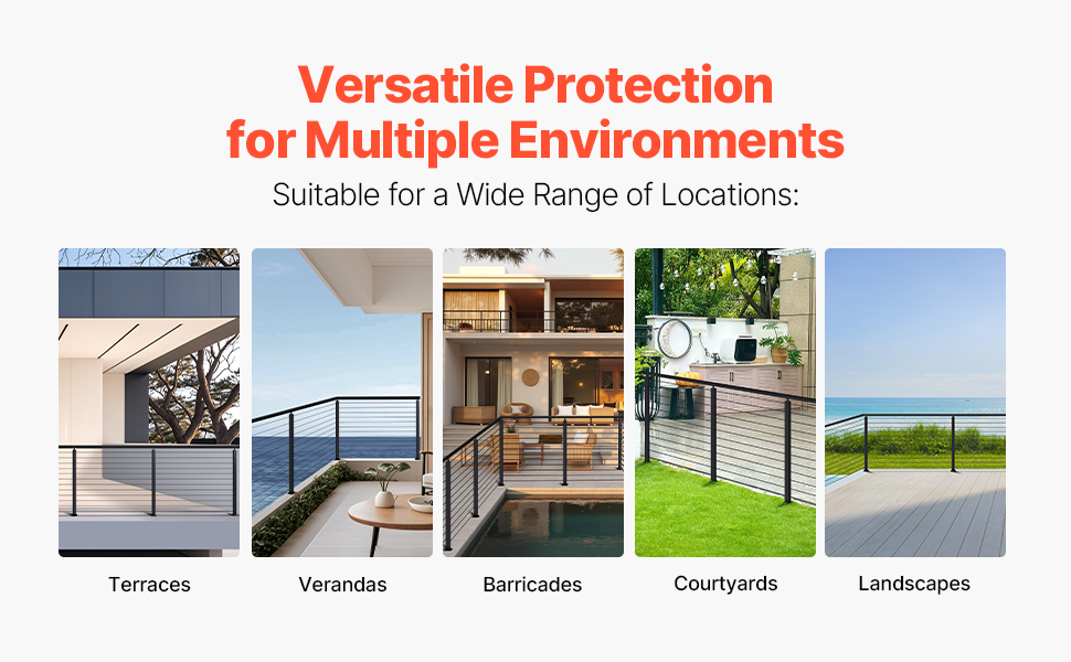 This deck railing kit is suitable for both indoor and outdoor protective applications, such as decks, stairs, porches, fences, patios, balconies, gardens, residential buildings, commercial offices, hotels, garages, and more.