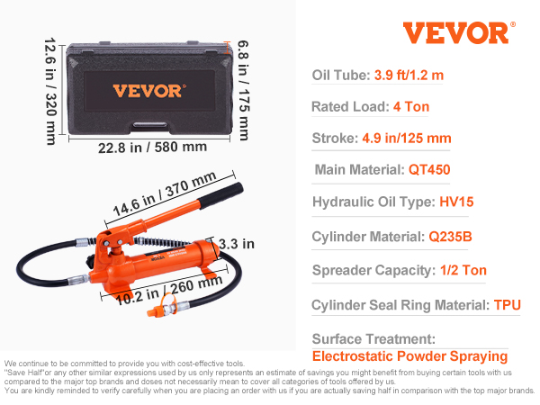 - Boost your Bull-Work Efficiency: The VEVOR porta power kit with a 4-ton hydraulic pump is the ultimate heavy-lifter you need for all your repair needs. The automatic overload system prevents any damage to the equipment or rams, while the hydraulic spreader with a 1/2 ton capacity makes all your repairs a breeze. Get your hands on this powerhouse today!