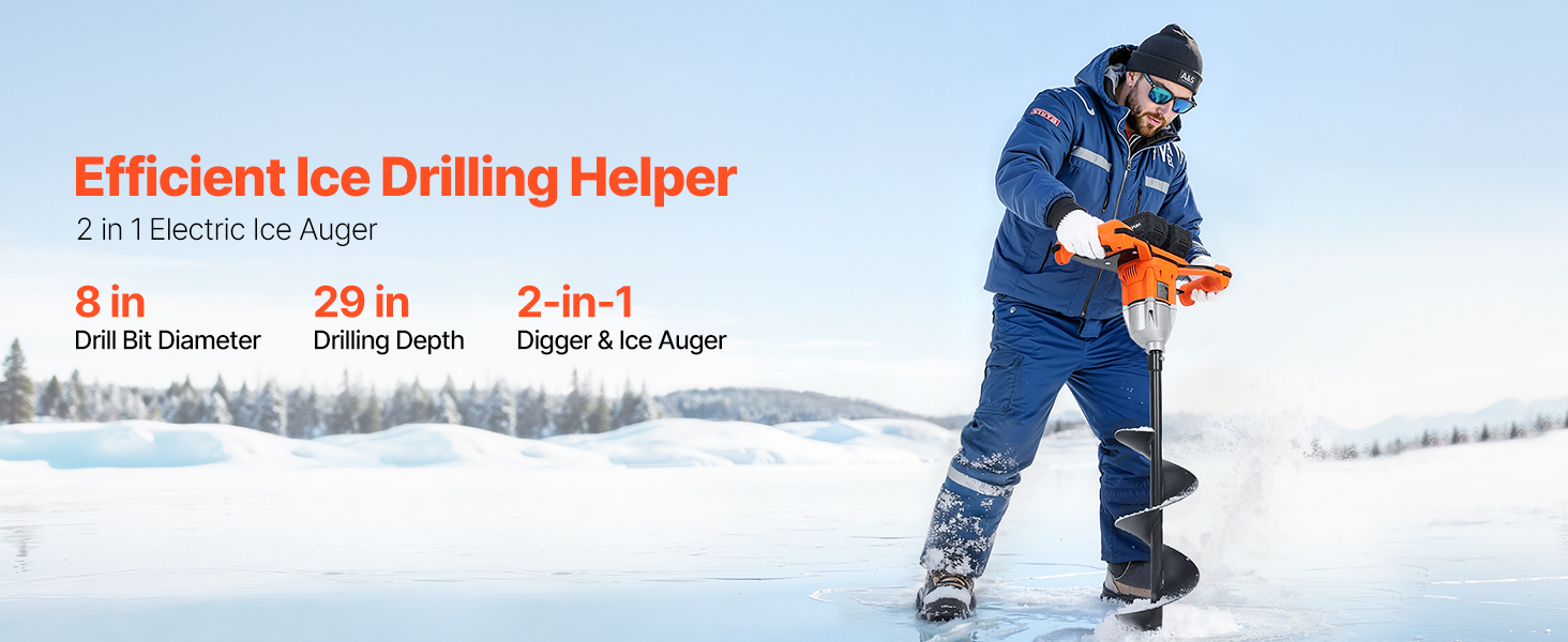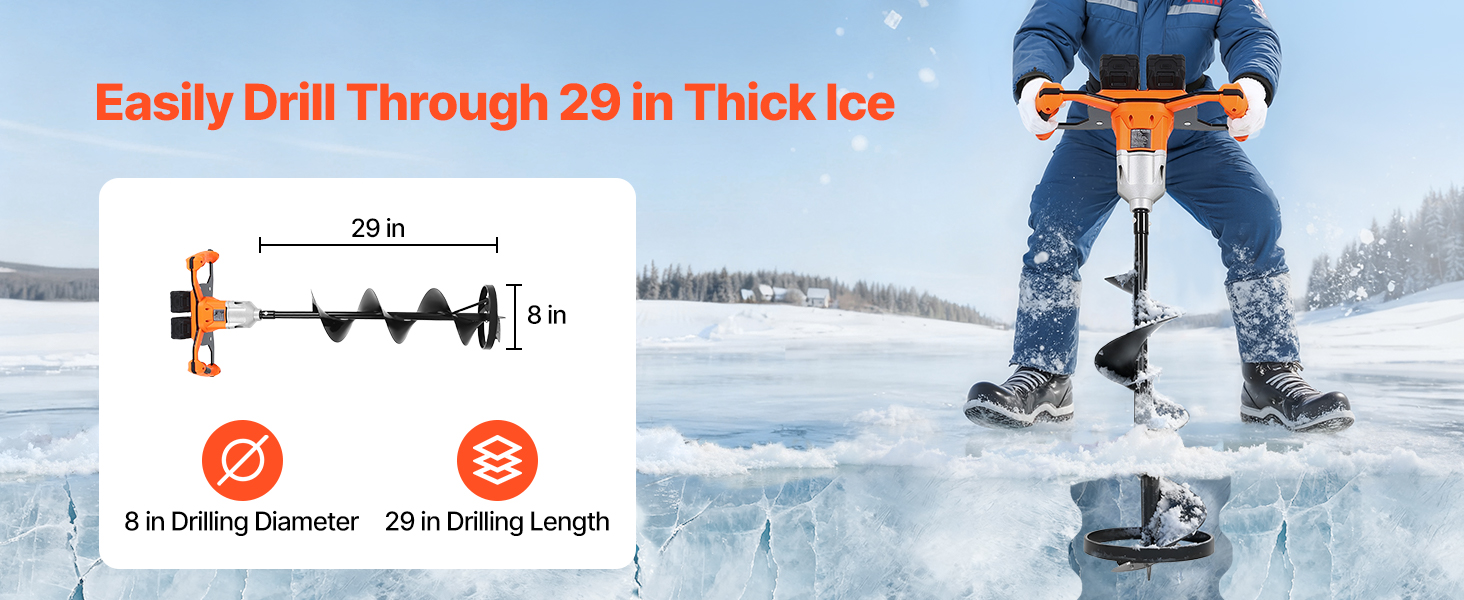 - Efficient Ice Penetration: Ice auger length: 31.5 in/800 mm, diameter: 8 in/203 mm. Equipped with low-temperature resistant, impact-proof steel spiral blades and sharp steel drill bits, this electric ice auger quickly penetrates hard ice, making it suitable for ice fishing, ice surveys, or rescue operations