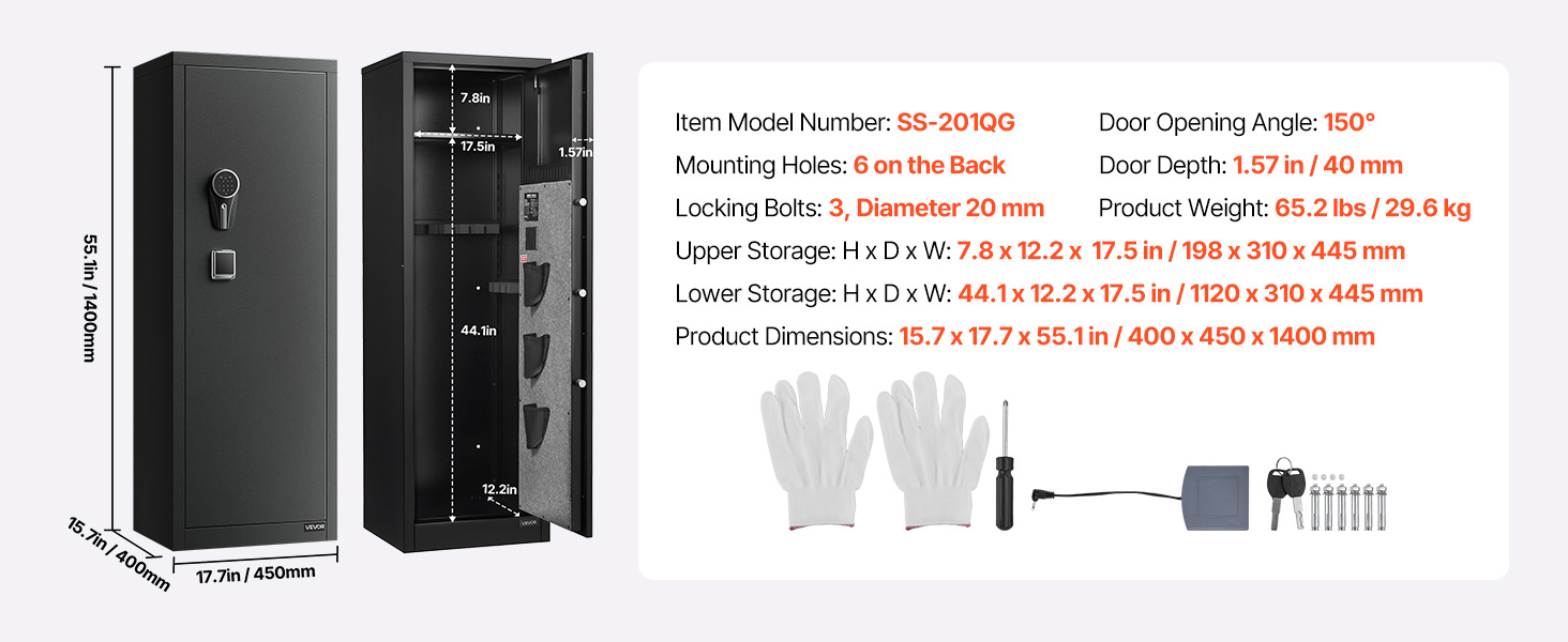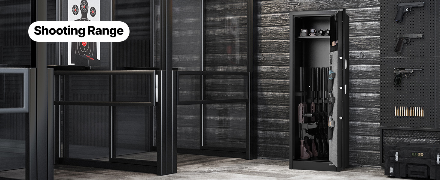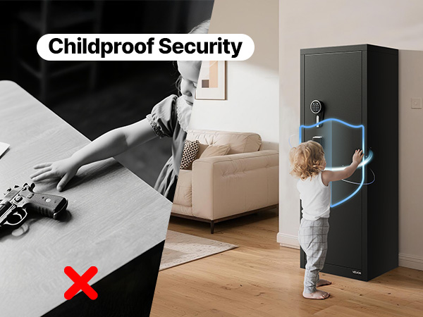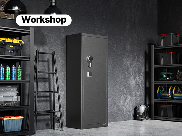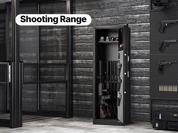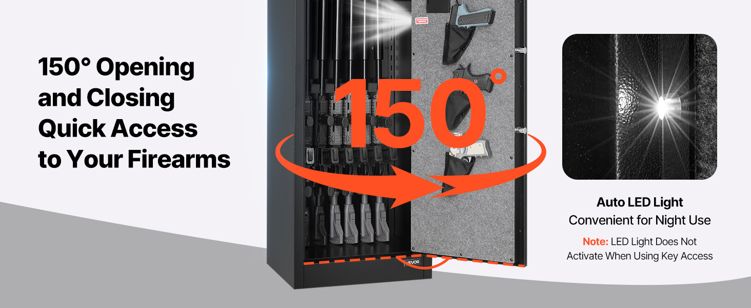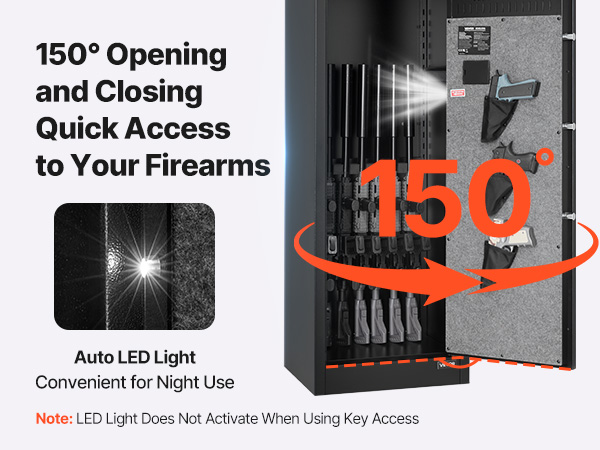 - Quick Access: The 150° wide-angle door opens fully for a clear view of all firearms, making it easy to quickly retrieve your weapons. Inside, it is equipped with auto LED lights, ensuring visibility even in low-light conditions.
