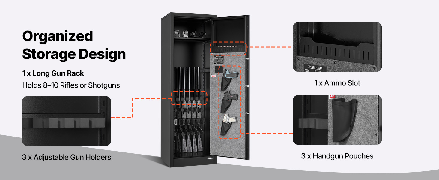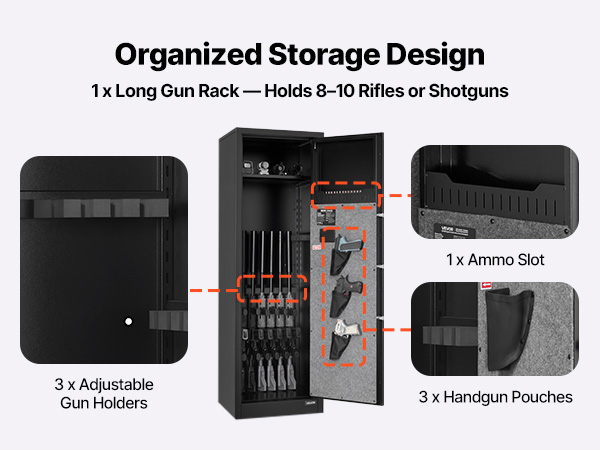- Large Capacity Safe: This gun safe can hold 8–10 rifles or shotguns and is equipped with a 3-pistol pouch, an ammo slot, and 3 adjustable gun racks. It ensures that your firearms and accessories are organized and easy to access.