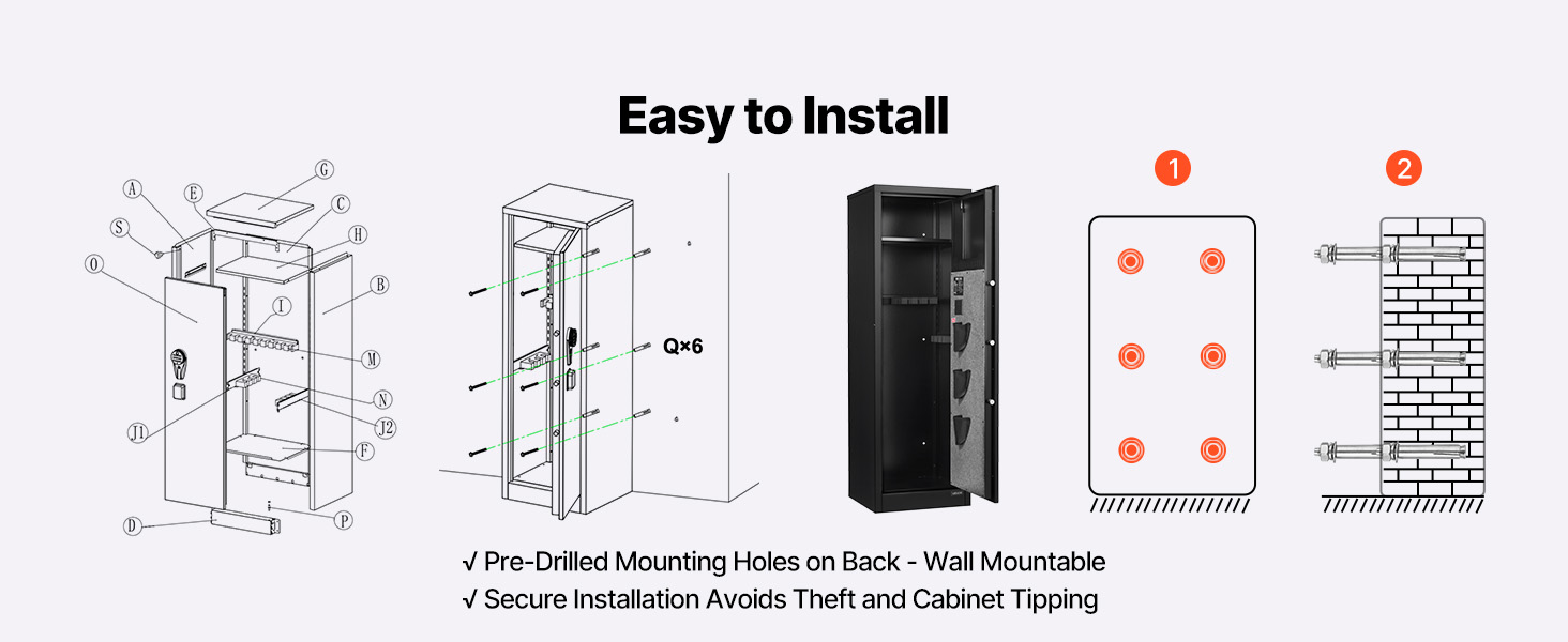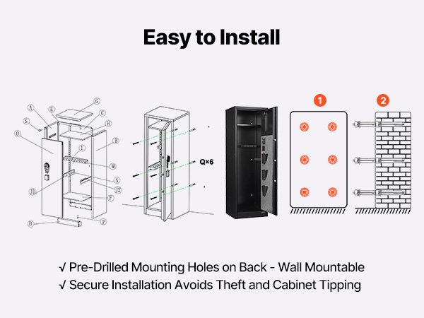 - Anti-pry Heavy-duty Cabinet: The rifle safe features a full steel construction with a 0.04 in / 1.1 mm thick anti-pry door plate, combined with 3 solid locking bolts to resist prying and damage. Pre-drilled mounting holes on the back allow for wall mounting.
