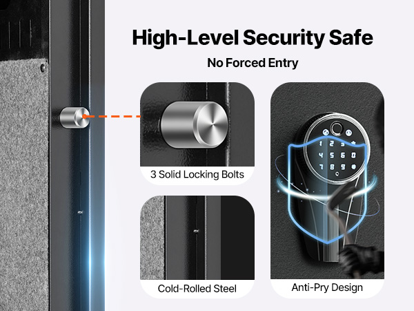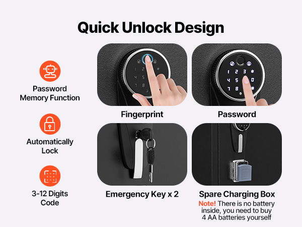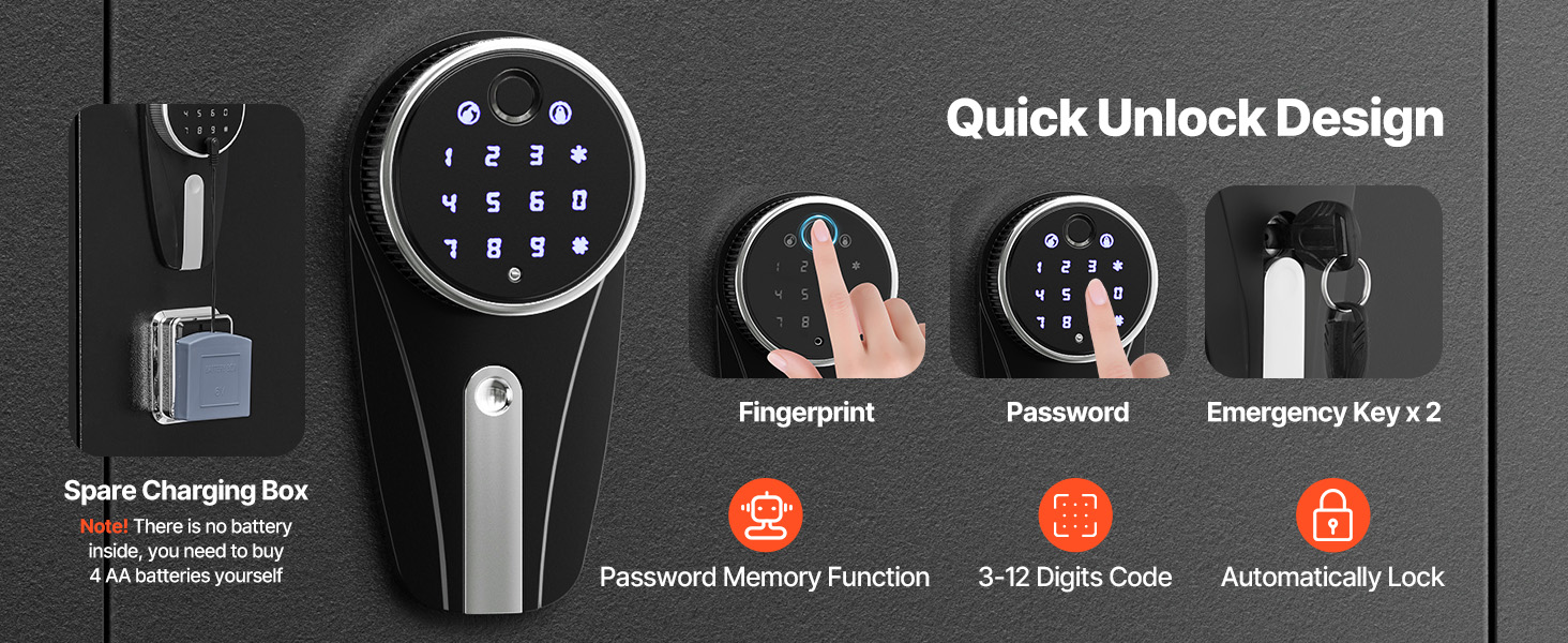 - Smart Lock: The 9-digit touchscreen keypad and fingerprint recognition provide quick access. The password can be set between 3-12 digits, with an auto-lock function for added peace of mind. It also includes an emergency key and spare charging box for unlocking during battery depletion. (Note: Batteries are not included; you need to purchase 4 AA batteries separately.)