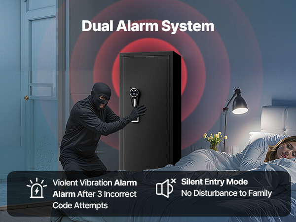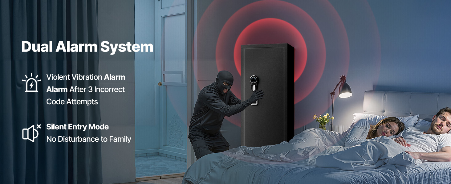 - Alarm System & Silent Mode: The system will automatically trigger an alarm if the wrong password is entered three times or if the gun cabinet is impacted. To activate Silent Mode, input 11#, enabling access to your firearms at night or during special circumstances.