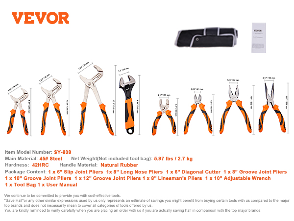 10 reviews for 8-Piece Pliers Set, High Carbon Steel, 12″/10″/8″ Groove Joint Pliers, 8″ Linesman’s Pliers, 6″ Slip Joint Pliers, 8″ Long Nose Pliers, 6″ Diagonal Cutter, 10″ Adjustable Wrench, and Tool Bag