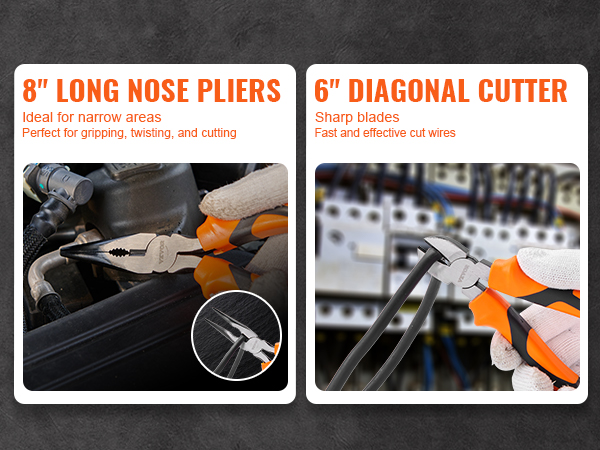 Our long nose pliers are designed for precise work in narrow areas, providing exceptional maneuverability. The diagonal cutting pliers excel at cutting various materials, delivering sharp and clean cuts without leaving any rough edges or residue behind.