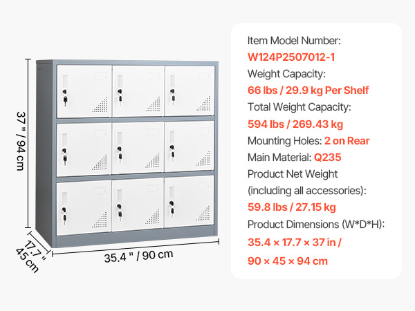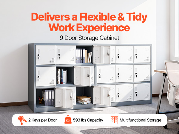2 reviews for 9 Doors Metal Locker, Lockable Steel Storage Cabinet, 66 lbs Loading Capacity, 2 Keys for Each Door, 3 Tiers Employee Lockers for Office, School, Gym, Easy Assembly, 35.4 x 17.7 x 37 in, Gray