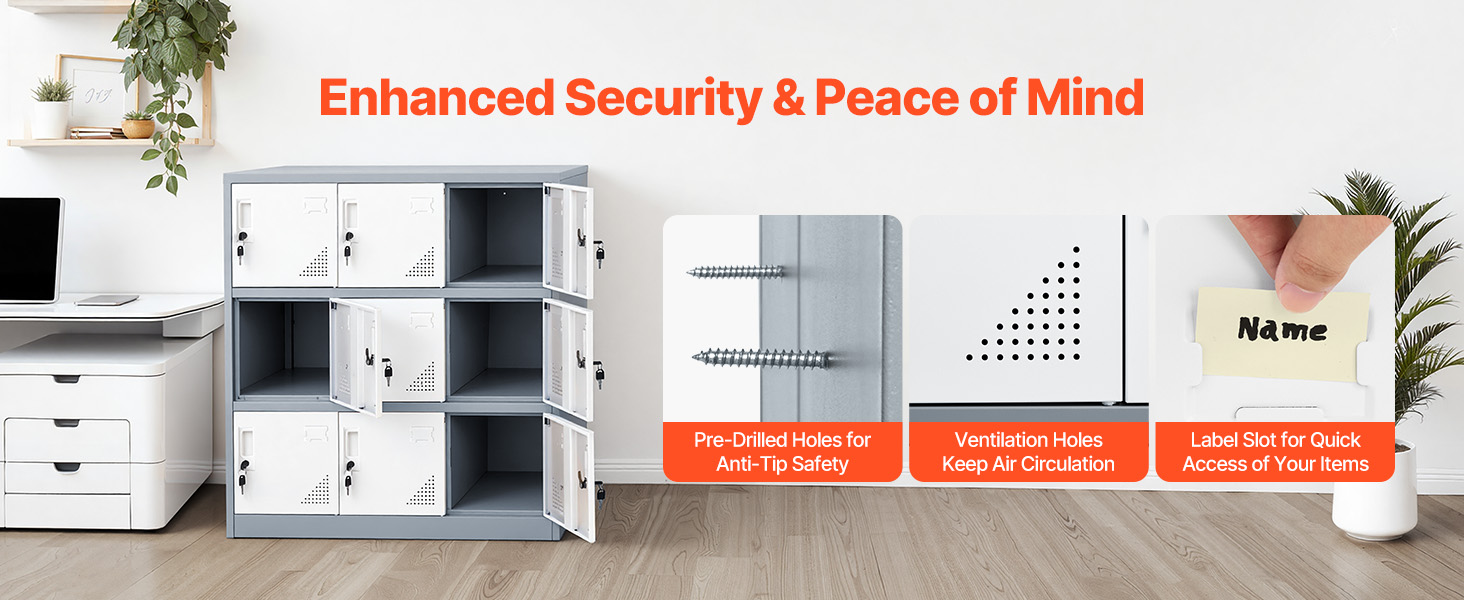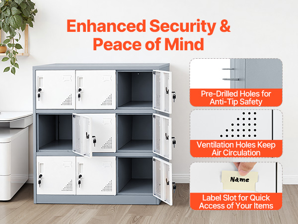 • User-Friendly Design: This storage locker features ventilation slots to maintain airflow and prevent odors, with label holders for easy identification. A fixed full-length base ensures stability and weight support. Always install the included anti-tip kit.