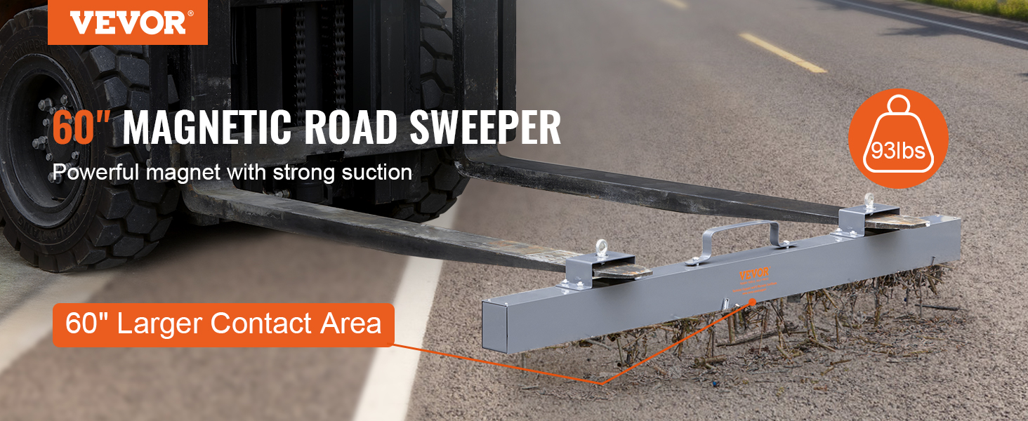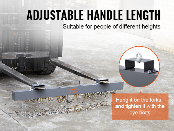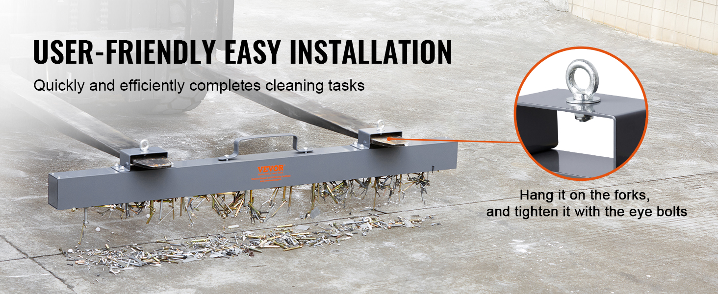 The hang-type magnetic sweeping tool is easy to use. Just need to place it on the forks, and then use the eye bolts to stabilize it; you can also use some chains to connect it to your vehicle.