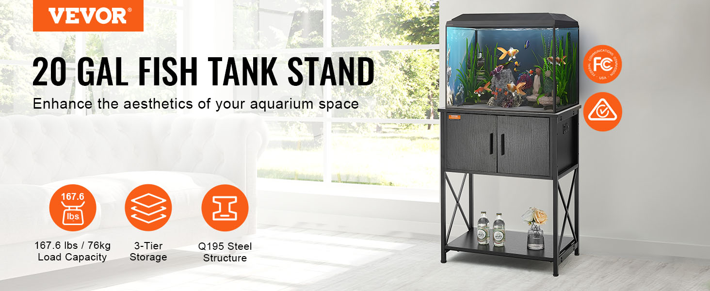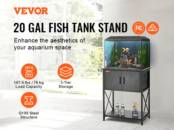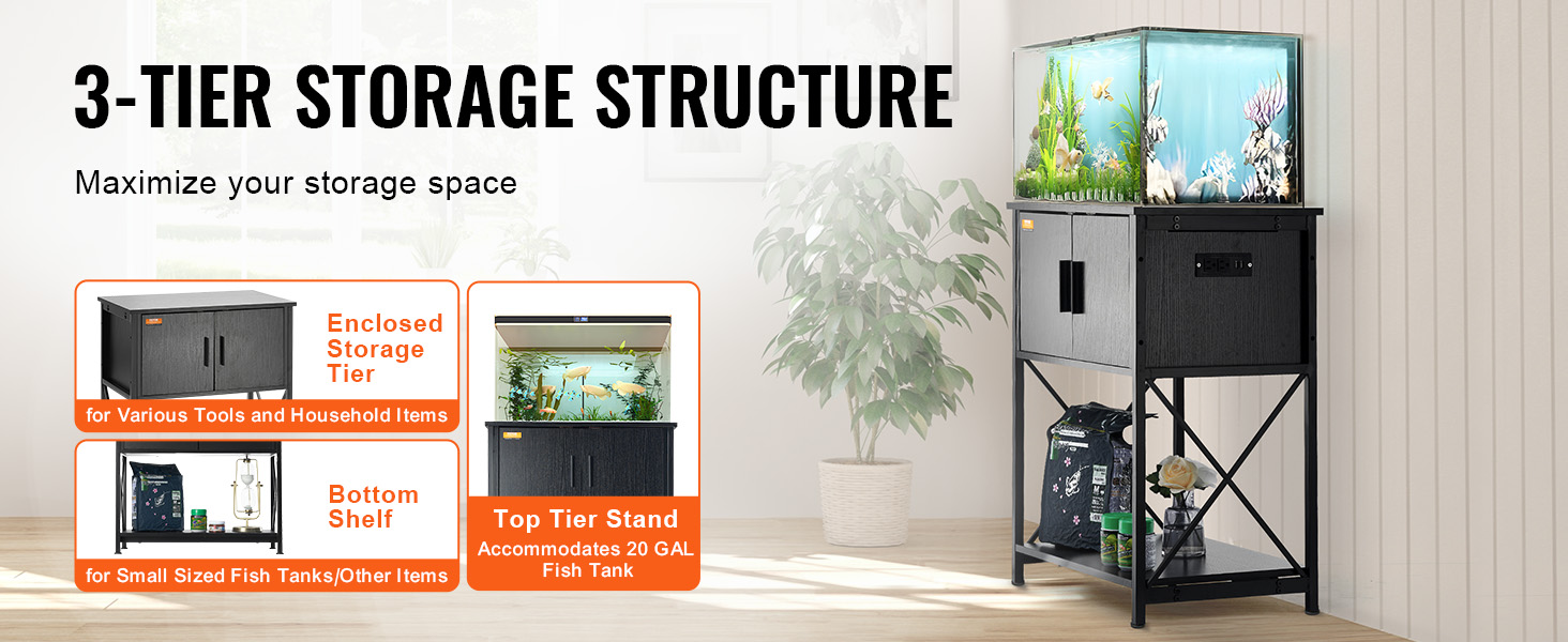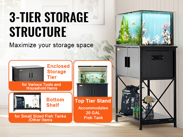 Our household aquarium stand accommodates up to a 20-gallon tank. Constructed with Q195 steel frame, the stand can support up to 76 kg / 167.6 lbs. The 3-tier multiple storage layers design and the embedded socket provides ample storage space for your convenience.