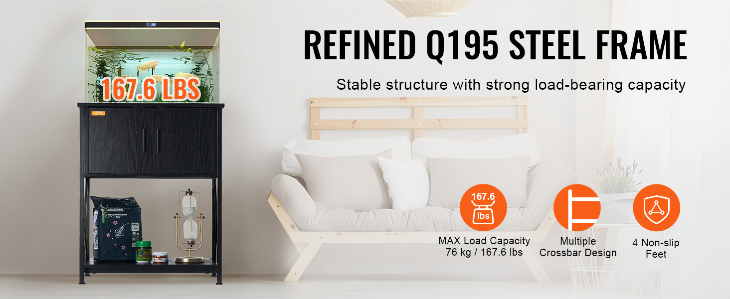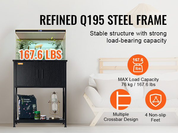 • Robust Load Capacity: The fish tank stand is constructed with multiple crossbar steel frames. Fixed rubber feet adapt to uneven surfaces, providing non-slip and leveling functions. It can support a maximum weight of 76 kg / 167.6 lbs.