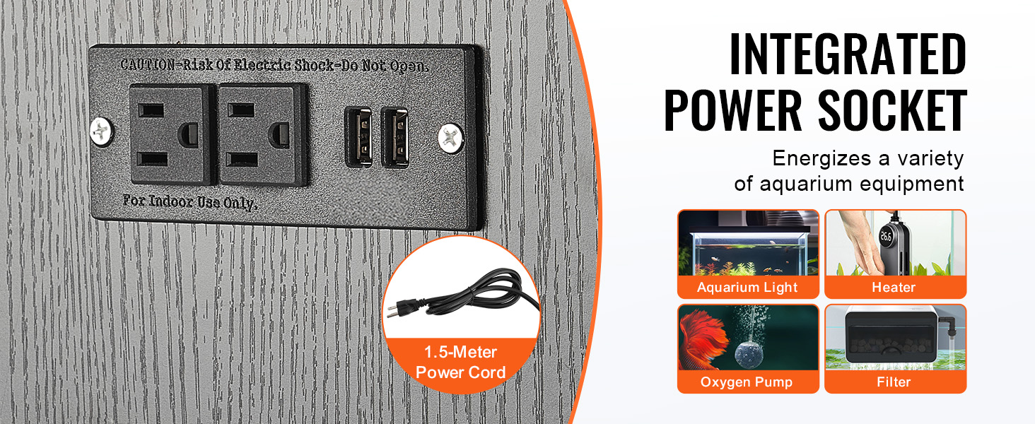 Our fish stand features a built-in power outlet with 2 AC and 2 USB ports. It allows for the electrical operation of various aquarium devices such as aquarium lights, heaters, air pumps, and filters.