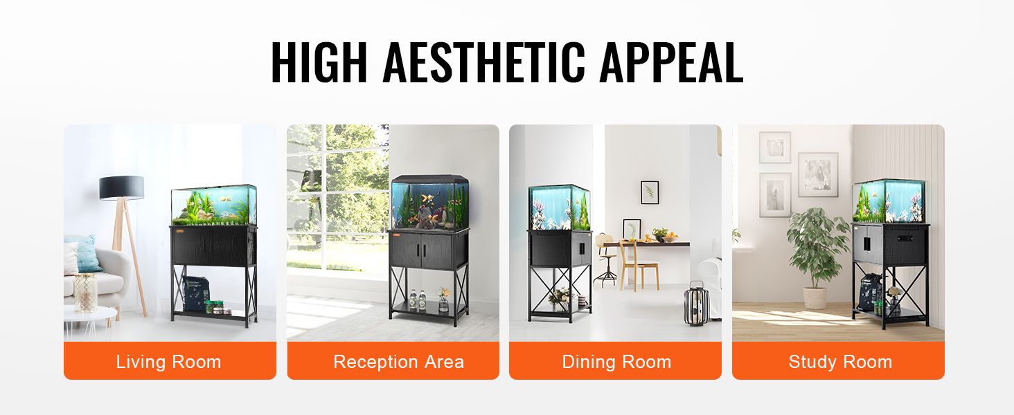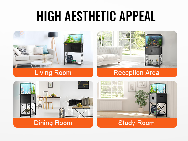 • Stylish Design: Our aquarium stand features a sleek black exterior, effortlessly blending with various interior décor styles. You can place it in your living room, reception area, dining room, study, and more.