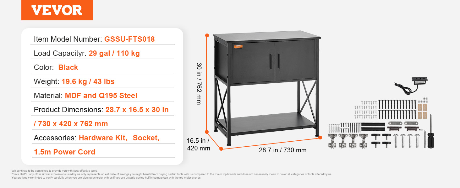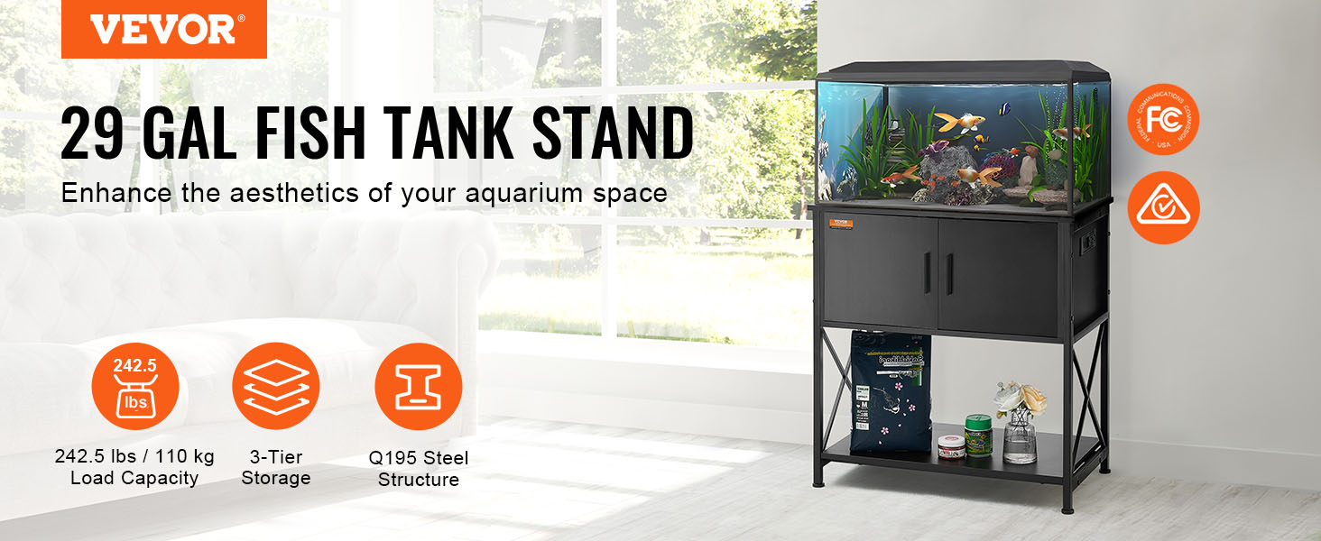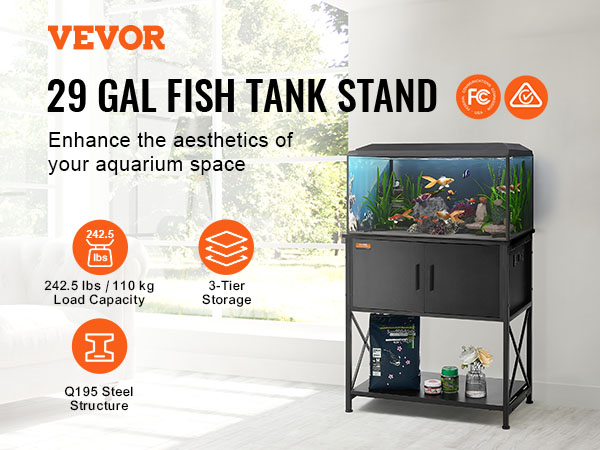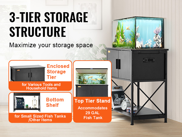 Our household aquarium stand accommodates up to a 29-gallon tank. Constructed with Q195 steel frame, the stand can support up to 110 kg / 242.5 lbs. The 3-tier multiple storage layers design and the embedded socket provides ample storage space for your convenience.