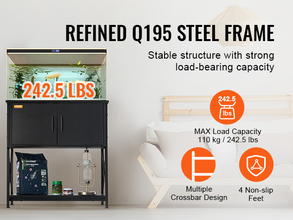 - Robust Load Capacity: The fish tank stand is constructed with multiple crossbar steel frames. Fixed rubber feet adapt to uneven surfaces, providing non-slip and leveling functions. It can support a maximum weight of 110 kg / 242.5 lbs.