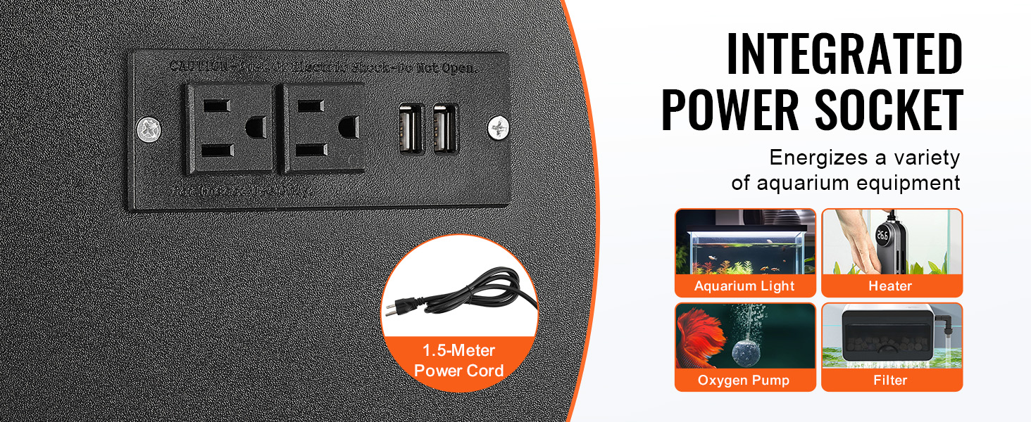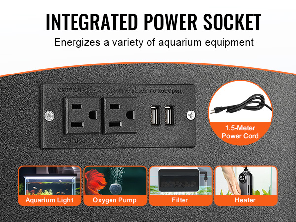 Our fish stand features a built-in power outlet with 2 AC and 2 USB ports. It allows for the electrical operation of various aquarium devices such as aquarium lights, heaters, air pumps, and filters.