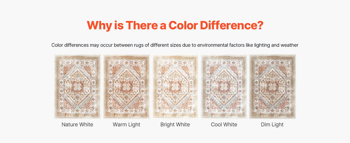 The color of the carpet in the pictures may be affected by environmental lighting and the color resolution of electronic devices. However, we strive to present the color and pattern as closely as possible to the actual product.