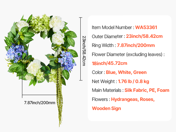 - 1:1 Replica Flower Design: This decorative wreath features a precise 1:1 replica flower design, full and lush, with each hydrangea, rose, and leaf exquisitely crafted to be lifelike. The colors are vibrant and the details are finely rendered, creating a realistic appearance.