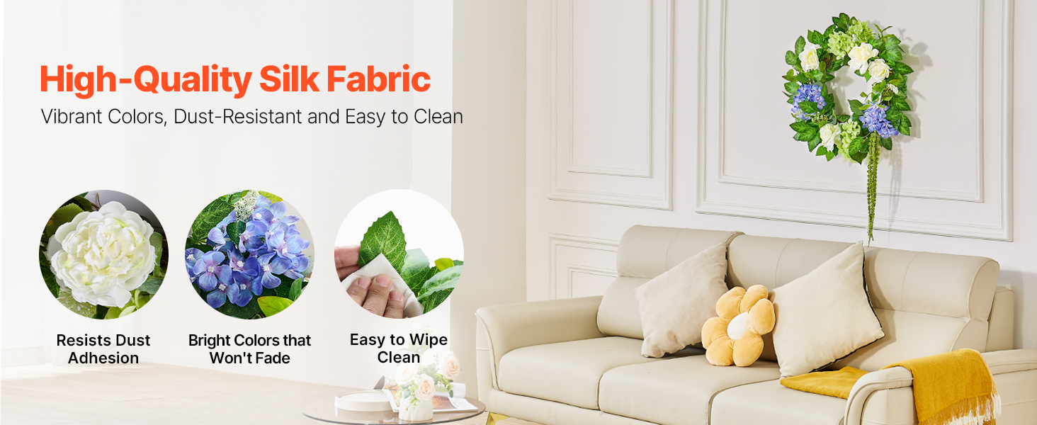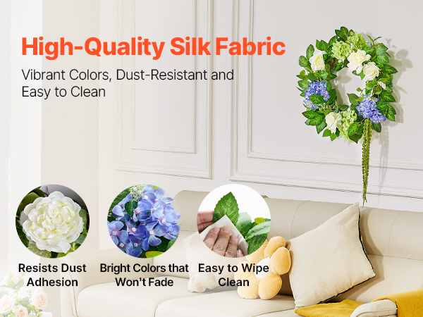 Crafted from high-quality silk fabric, this front door wreath’s surface is smooth and dust-resistant, maintaining vibrant colors without fading over time. It can be gently wiped with a damp cloth or washed, making it suitable for long-term decoration in various settings.