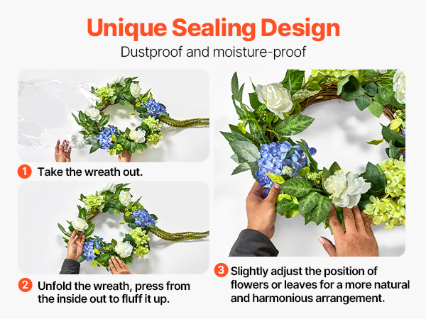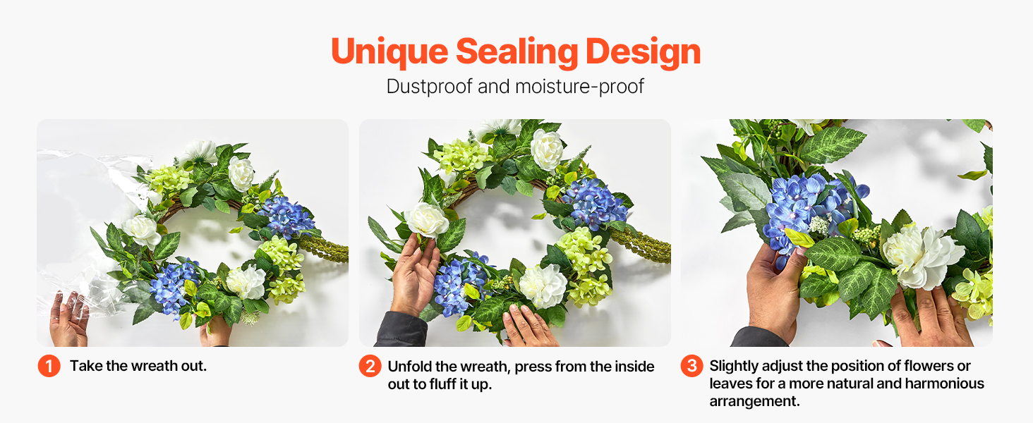 Please take out the indoor wreath and unfold it. Press from the inside out. Straighten each flower and leaf, ensuring an even, entire appearance. Install hooks or nails at the desired location, then hang the wreath to complete the decoration. Simple steps can beautify your space.