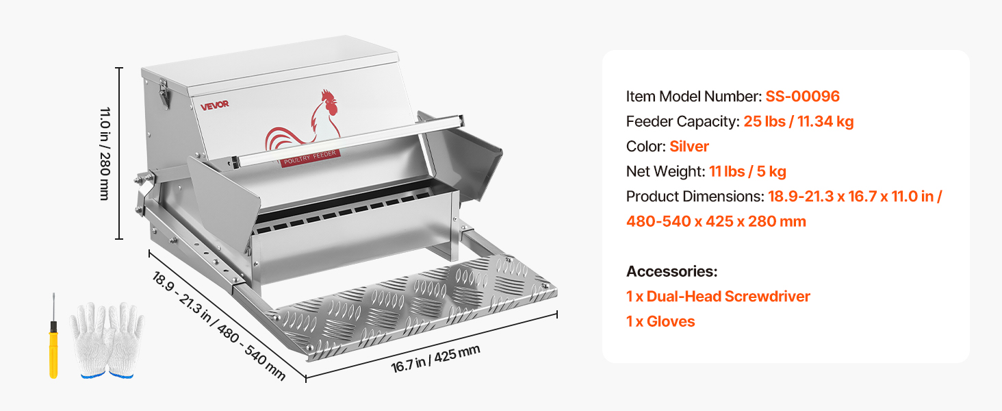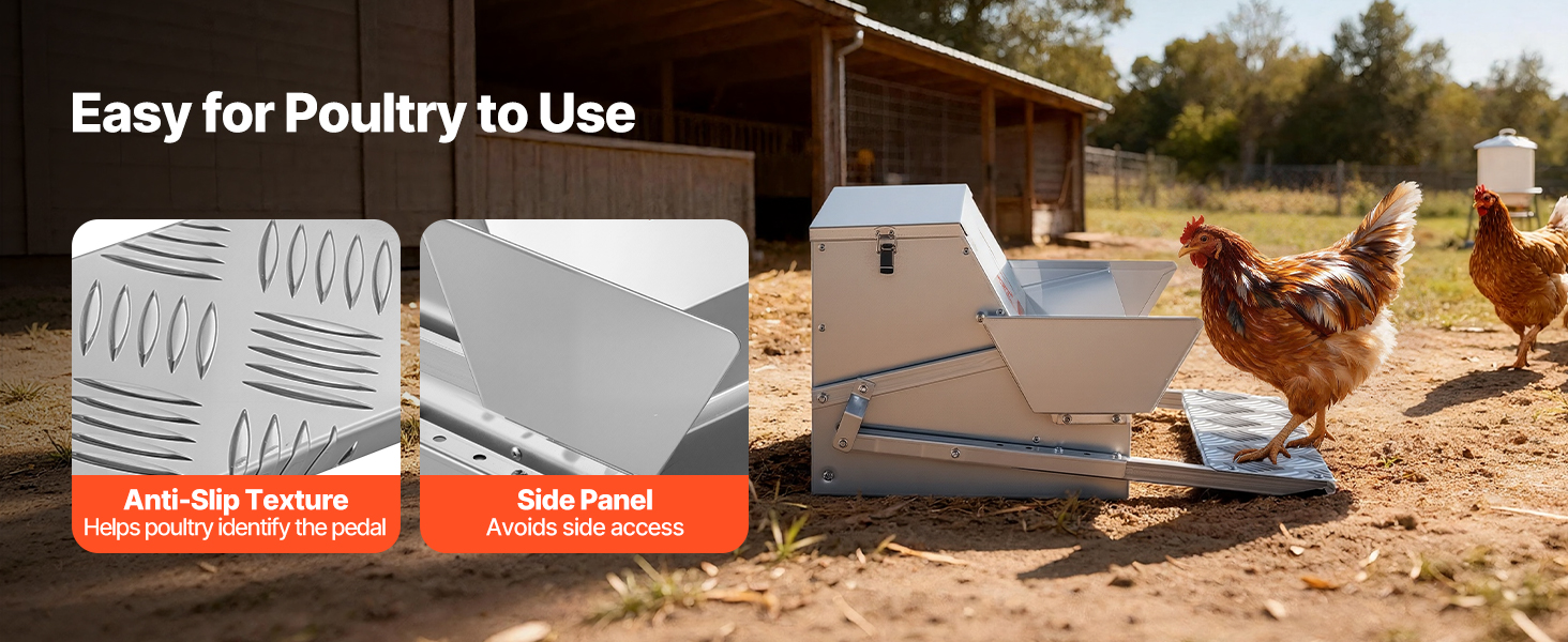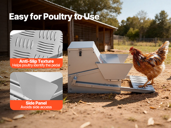 - Adjustable for Different Poultry: The treadle poultry feeder adjusts from 18.5 in (470 mm) for small/young birds to 20.7 in (525 mm) for medium/adult poultry. Textured, non-slip surface helps chickens adapt, and side panels avoid injury from side feeding.