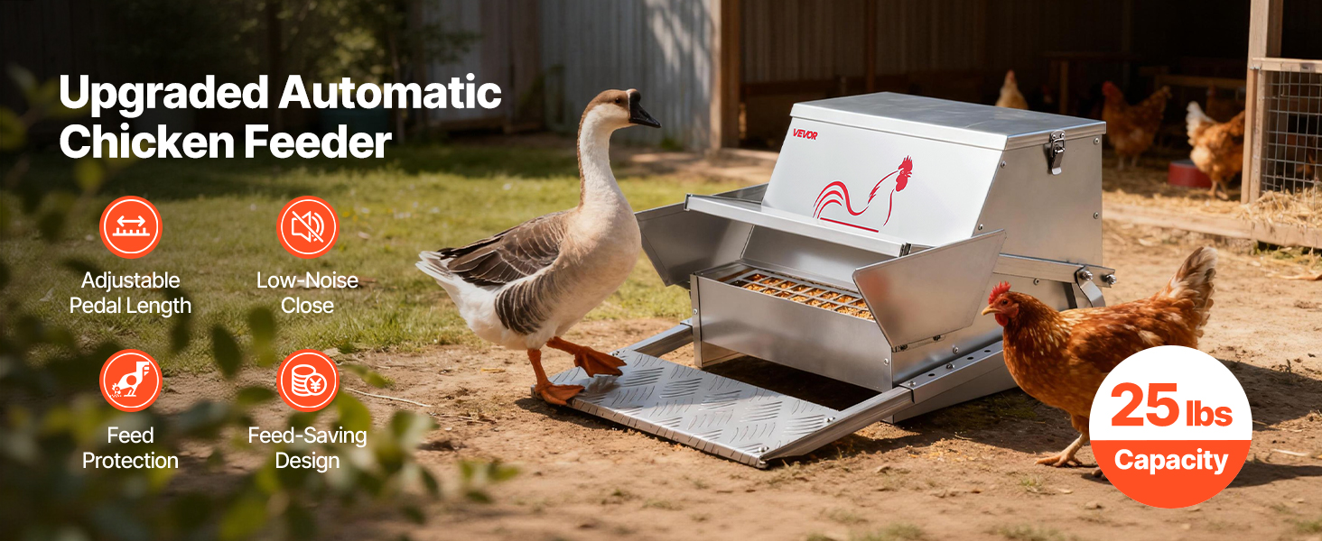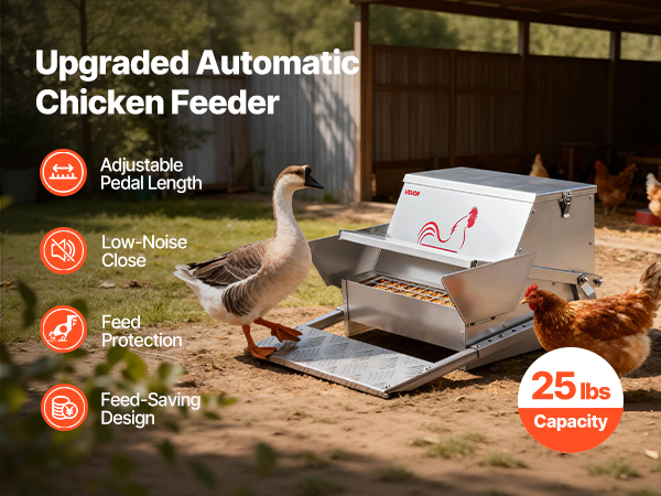 This 25 lbs automatic chicken feeder features an adjustable treadle length, allowing you to customize it based on poultry size. Suitable for medium and small chickens and other poultry.