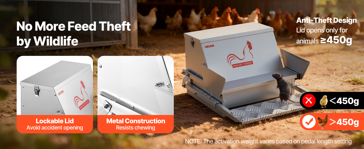 With a theft-proof treadle design, our treadle chicken feeder supports only animals over 450g that can access the food. It keeps smaller animals like squirrels and birds from stealing the feed.