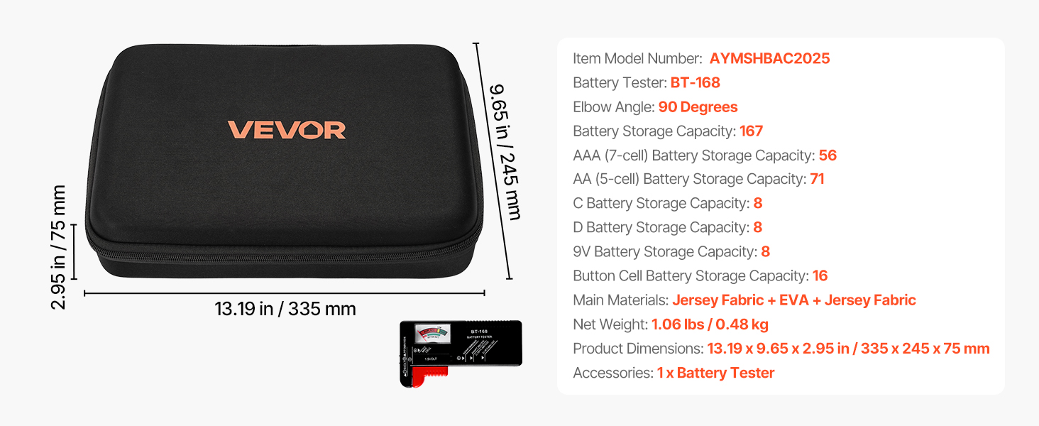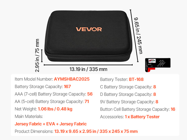 This durable, shock-resistant battery case holds over 167 batteries and includes a BT-168 tester. Its organized design, handle, and zipper make it portable and secure, ideal for home, office, and electronics use.