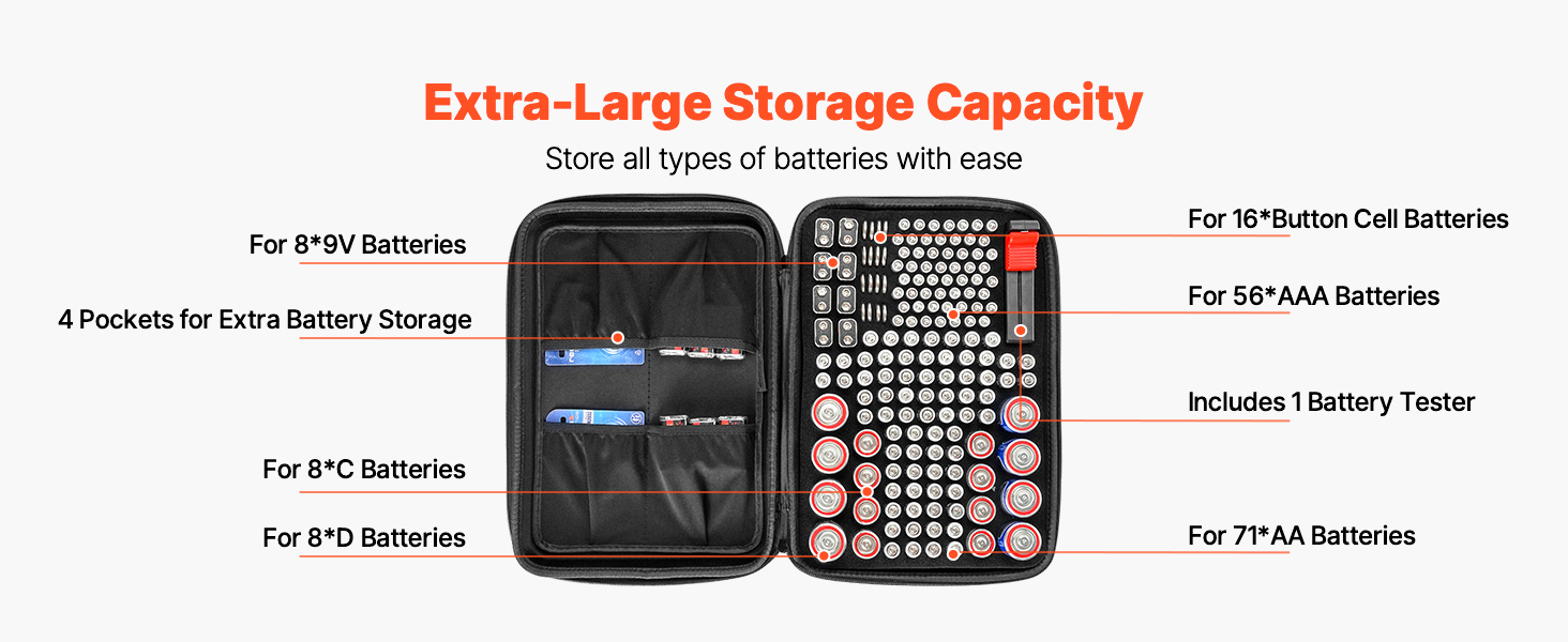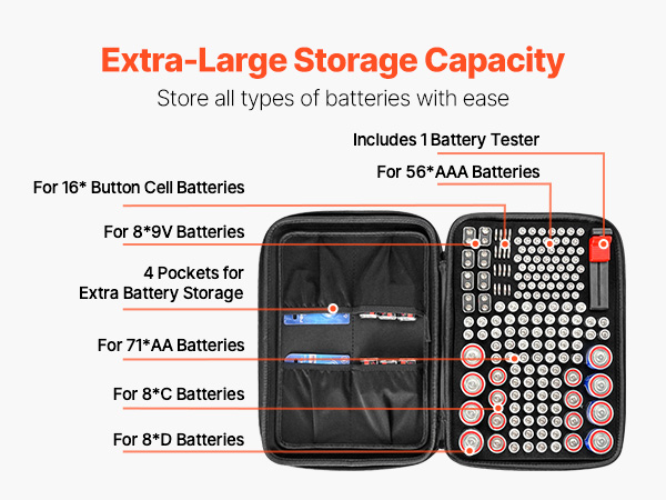 - Large Capacity Design: This battery storage organizer holds over 167 batteries and includes a BT-168 tester. It features organized storage for: