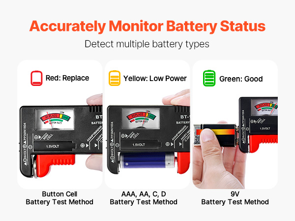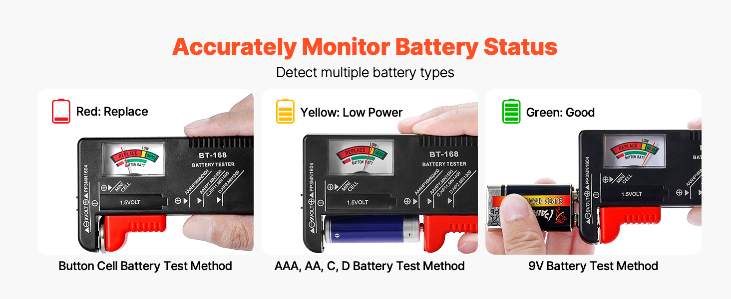 - Built-in Battery Tester: The BT-168 tester features a three-color display—red for replacement, yellow for low power, and green for full charge—making it quick and easy to check battery status
