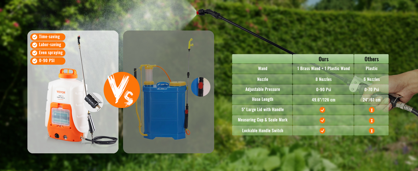 Are you tired of spraying by manual pumping over and over again? Well, look at our battery powered sprayer. It features a durable battery to save you time and labor. Spray your worries away and start your next project with VEVOR!