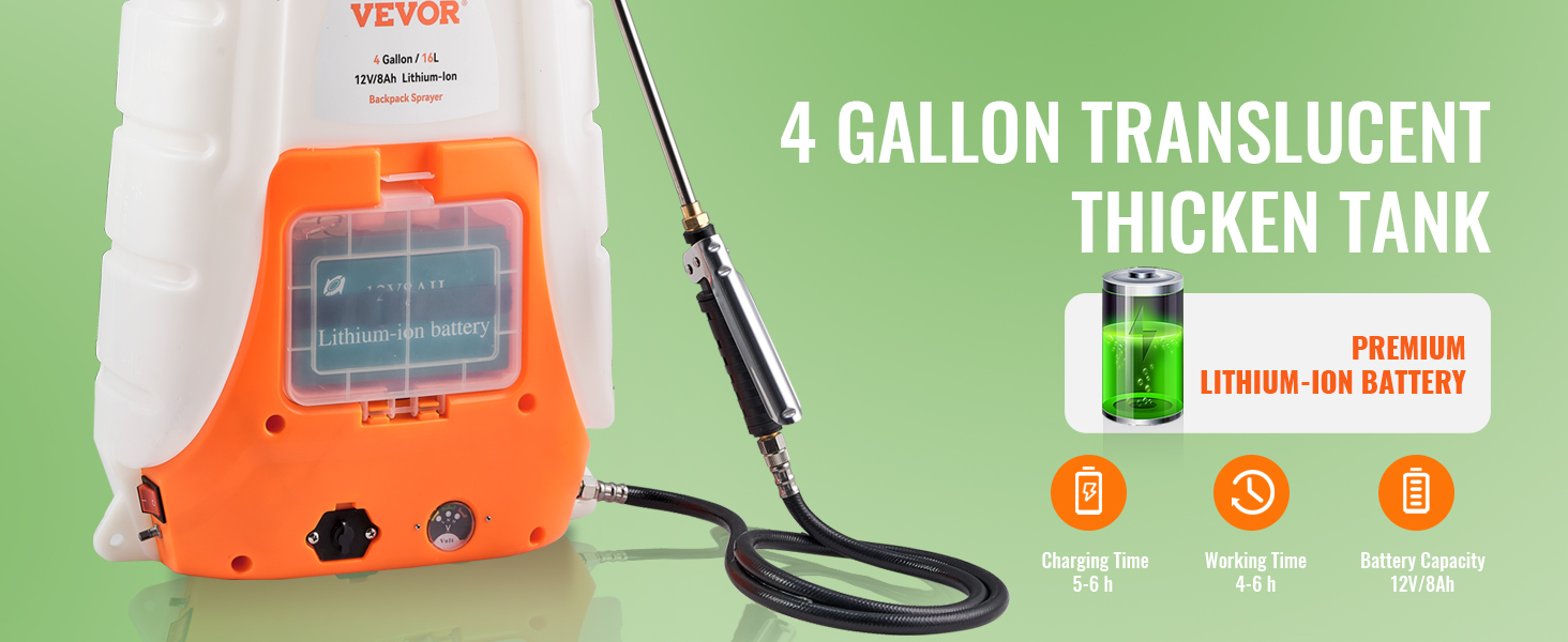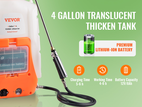 - No More Hand Pumping: Spraying has never been easier! VEVOR’s battery-powered sprayer features a durable 8Ah lithium-ion battery, which can spray for 4-6 hours straight from just one charge. The max. 90 psi pressure of the pump allows the flow rate to reach up to 4.1L/min. The 4 Gal/15 L capacity is large enough to meet your daily needs, saving you labor and time. Time to spray your worries away!