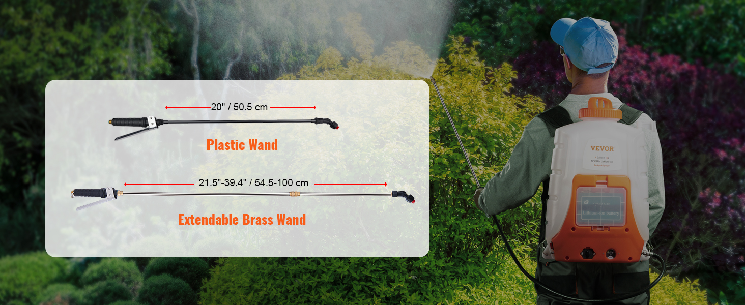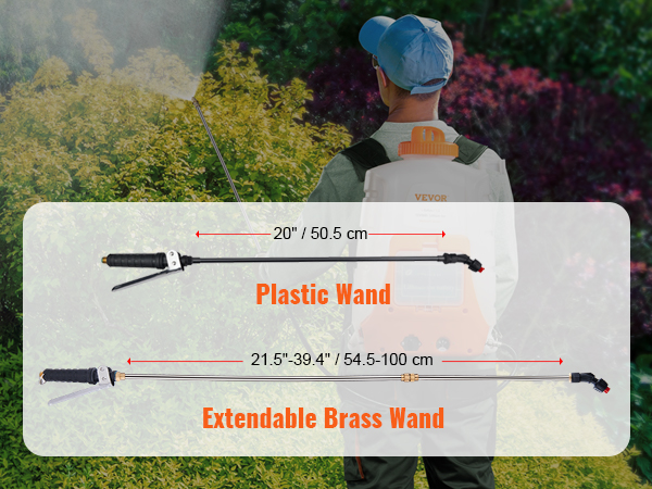 - Multiple Nozzles Available: Our battery powered sprayer comes with 8 nozzles and 2 wands, giving you more options to choose how you spray! The metal wand features an adjustable length of 21.5″-39.4″, and the plastic wand is suitable for bleaching agents and other corrosive liquids. The water pressure can be easily adjusted from 0 to 90 psi via the knob. Our sprayer will meet your various spraying needs with no trouble.