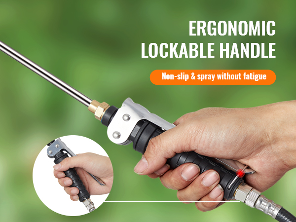 The ergonomic handle with a locking trigger is designed for long-time spray operation. Just lock the trigger at the handle for continuous spraying with a steady amount of water.