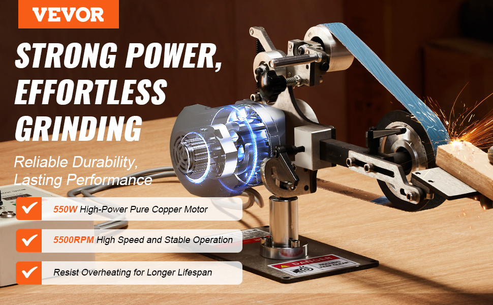 • Powerful Performance: Equipped with a 550W pure copper motor running at 200-5500 rpm, the VEVOR belt grinder sander delivers superior grinding power, quieter operation, and enhanced durability compared to ordinary motors. Enjoy smooth running and stable tracking without worrying about overheating.