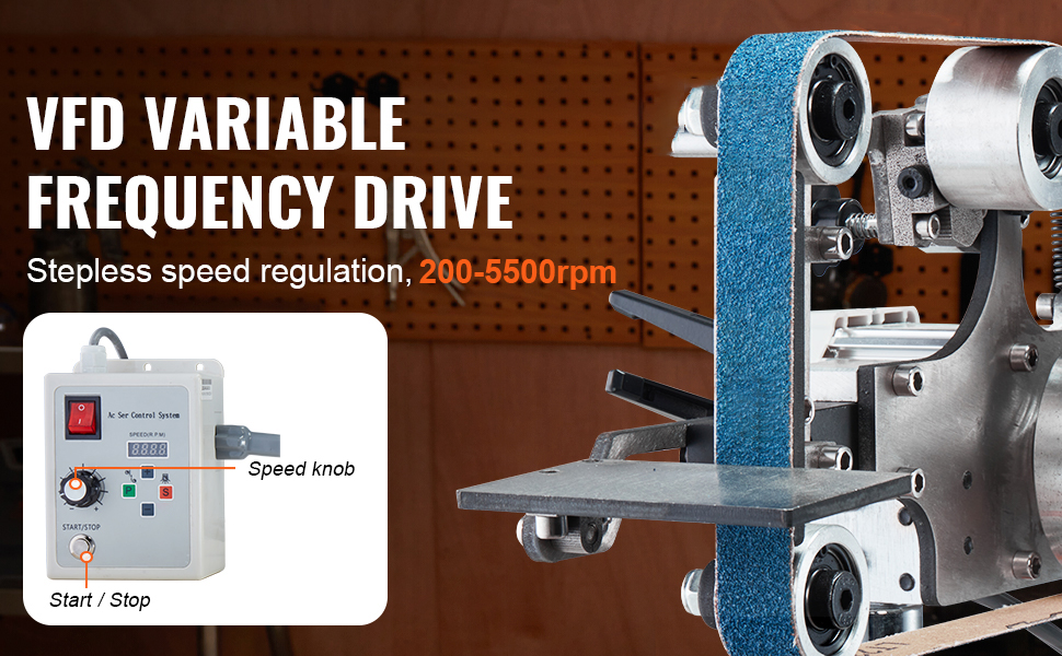 • Variable-Speed Control: Featuring a belt line speed of 26m/min and a VFD variable frequency drive, this belt polisher knife sharpener allows for stepless speed regulation. Easily switch between high-speed fast and low-speed fine sanding work, boosting working efficiency and protecting the motor.